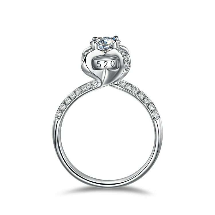 经典四爪镶,侧面为鸳鸯之心。钻石下方为可转动的圆圈,为钻戒增添了灵气。圆圈四个方向分别刻有两颗心、520、I LOVE U、AMO,四种不同方式,为爱指引。无论你身在何方,它都会把你带到我身边。