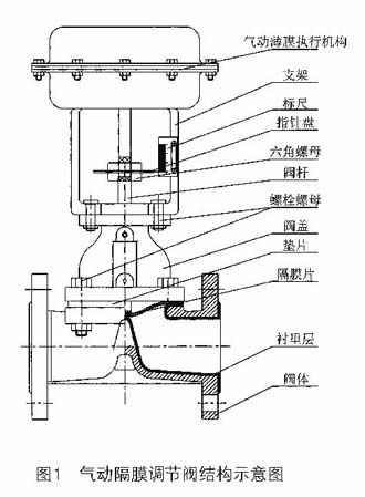 调节阀是由气动薄膜执行机构与调节机构二部分组成,其结构与原理见图。隔膜阀与被调介质直接接触,由于隔膜的运动,改变了与阀体截面间的流通面积,从而调节介质的流量。